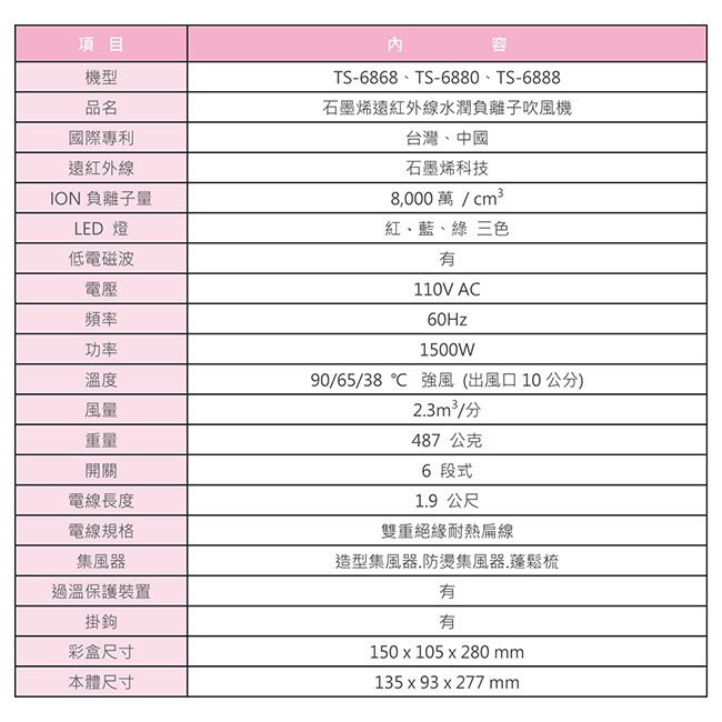 【TASHIN達新牌】石墨烯遠紅外線水潤負離子吹風機TS-6868