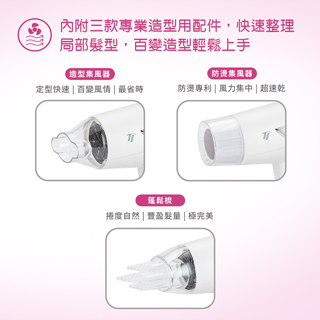 .附贈造型集風器.蓬髮梳:輕鬆造型吹整.維持捲度豐盈髮量