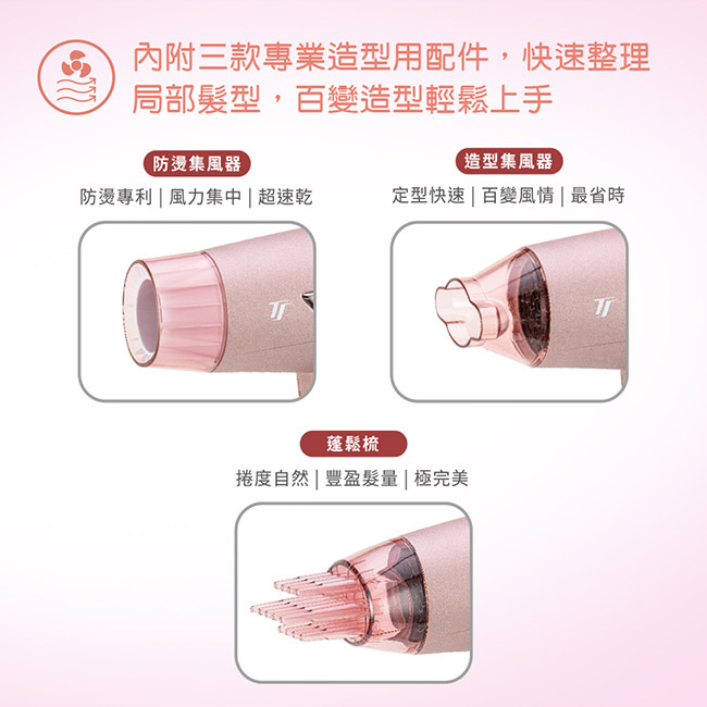 .附贈蓬鬆梳、防燙集風器、造型集風器