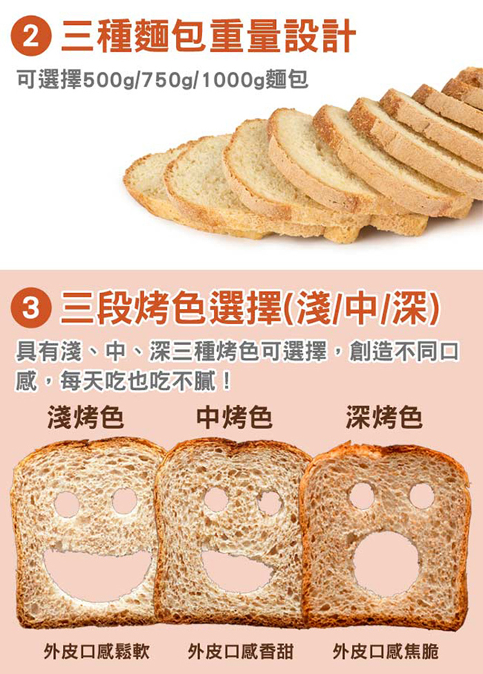 ◎三種麵包重量設計,可選擇500g/750g/1000g麵包